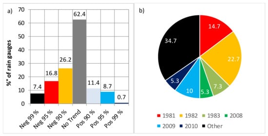 Percentages of annual rainfall series presenting positive or negative significant trends (a) and most probable change point years (b).