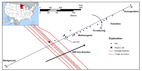 Map of the Bemidji crude oil spill site along the center-line transect of the contaminant plume (A-A’). Blue circles are wells sampled between 2011 and 2015. Well 421 (denoted by a star) is the approximate center of the oil body and is the zero-reference point for this study. Values for background aqueous phases used for initial conditions and constant concentration fluxes are determined from the upgradient well labeled “Background”. The 10 µg/L As contour is from Cozzarelli et al. [29].