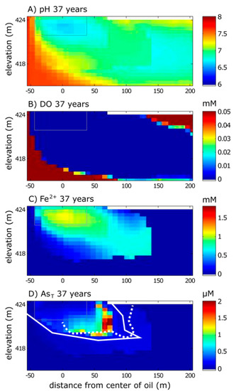 Model simulation results from the calibrated model for (A) pH, (B) DO, (C) dissolved Fe2+, and (D) total dissolved As (AsT) for 37 years after the oil spill (2016). The solid white line for dissolved AsT represents the simulated 10 μg/L front. The dashed white line for AsT represents the approximate extent of the 10 μg/L front based on field sampling (data available in [29]). The gray box is the reference for the oil body extent. Top boundary is the water table.
