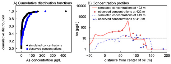 Comparisons of observed As concentrations from well sampling (data in [29,31]) and simulated concentrations from the calibrated model. (A) Cumulative distribution functions for dissolved As concentrations 37 years after the spill. Model simulation data (n = 480) are shown in black; observed concentrations from well sampling (n = 48) are shown in blue. (B) Arsenic concentration profiles at elevations of 422 m (red), and 419 m (blue) for 37 years after the spill. Simulated concentrations are shown in lines and observed concentrations from well sampling are shown in circles. Open circles designate samples that were reported as <10 µg/L, and thus are plotted at half the detection limit. The dashed horizontal line shows the 10 µg/L MCL for As.