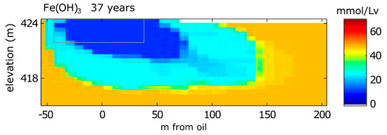 Model simulation results for solid phase concentrations of Fe(OH)3 in 2016 (37 years after the oil spill). The gray box is the reference for the extent of the oil body. The top boundary is the water table.