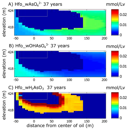 Model simulation results for As(V) and As(III) species sorbed to Fe(OH)3 in 2016 (37 years after the oil spill). (A) Hfo_wAsO42− and (B) Hfo_wOHAsO43− are As(V) species; (C) Hfo_wH2AsO3 is an As(III) species. Hfo_wH2AsO4, Hfo_wHAsO4− are not shown because they do not participate in As cycling under the conditions of this site. The gray box is the reference for the extent of the oil body. The top boundary is the water table.