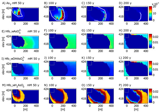 Model simulation results for several As species for the time periods of 50 years (2029), 100 years (2079), 150 years (2129), and 200 years (2179) after the spill. Modeled species include dissolved As (A–D) and sorbed species Hfo_wAsO42− (E–H), Hfo_wOHAsO43− (I–L), and Hfo_wH2AsO3 (M–P). Hfo_wH2AsO4, Hfo_wHAsO4− are omitted because they had negligible concentrations throughout the model. The white line in the dissolved As plots represents the simulated 10 μg/L front. The gray rectangle is the reference for the extent of the oil body. Top boundary is the water table.