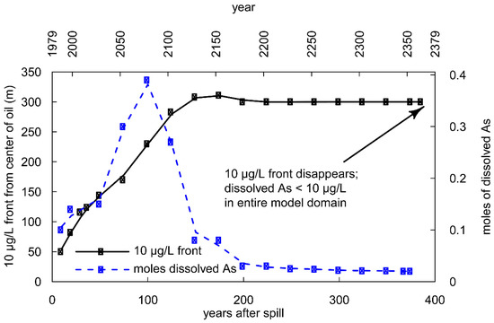 In the long-term simulations, As transport displays a “roll front” behavior, in which As is reductively dissolved, released into groundwater, and transported to the plume’s leading edge, where it then sorbs to Fe(OH)3 (Figure 7). Over time, the plume expands and As is remobilized as As-bearing Fe(OH)3 reductively dissolves. Then dissolved As is re-attenuated at the plume’s new leading edge further downgradient. This can be seen in the model output by observing changes in the location of the center of As mass, the 10 μg/L front, and the zone of accumulated sorbed As over time. For example, between 50 and 100 years, the center of As mass migrates from ~80 m downgradient from the oil body to 200 m, the 10 μg/L front migrates from 128 m to 225 m downgradient, and the zone of accumulated sorbed As migrated from 100–200 m to 200–300 m downgradient (Figure 7). These simulations suggest that the center of As mass migrates faster (average rate of 2.4 m/y) than the 10 μg/L front (average rate of 1.9 m/y) over this timeframe.