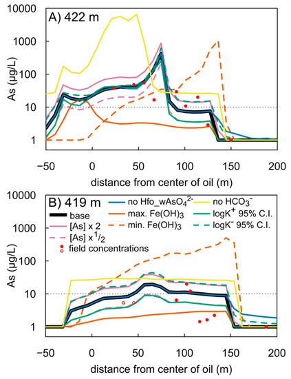 The As concentration profiles show that doubling and halving the initial sorbed As and increasing and decreasing complexation logK values had a minimal effect on the distribution of As at 422 m and 419 m elevations (Figure 9), whereas changing the initial concentration of Fe(OH)3 substantially impacts As concentrations. When the initial concentration is overestimated, the As plume becomes over-attenuated, and the dissolved As maximum at 422 m elevation occurs upgradient from the center of the oil compared to the base model, where the maximum occurs 65 m downgradient. Additionally, the maximum As concentration is an order of magnitude less than the base model and barely exceeds the 10 μg/L threshold. At 419 m elevation, dissolved As never exceeds the 10 μg/L threshold. This under-representation of dissolved As occurs because there is an excess of Fe(OH)3, and thus, an excess of surface sites to sorb As, which amplifies As attenuation. Underestimating initial Fe(OH)3 has the opposite effect. At 422 m, the dissolved As maximum occurs at 145 m, 23 m further than the base model, though the As maximum concentration is roughly similar. At a depth of 419 m, the magnitude of As in groundwater is grossly overestimated (note log-scale). These trends occur because there is less Fe(OH)3, and thus fewer surface sites to sorb As, which allows for more persistent As in groundwater and further As transport. These two scenarios illustrate the critical importance of accurate background sediment chemistry, as an overestimation or underestimation of initial Fe(OH)3 can cause substantial errors in predicting As mobility.