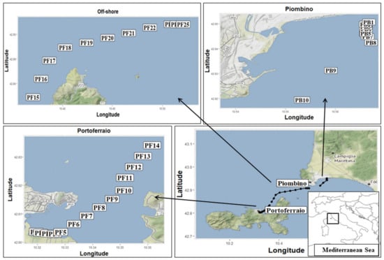 Map with the location of the Piombinochannel, and the three study areas along the seaway (Piombino, PB1-10, Portoferraio, PF1-14, and offshore, PF15-25).