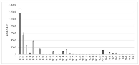 PAHs concentrations are shown in Table A2. The sum of the 16PAHs (Figure 2) required by national legislation (Σ16PAH, all analysed PAH except BeP) ranged from 9.72 µg/Kg d.w., at PB3 to 11,689.36 µg/Kg d.w. in PF1. The concentration of Σ16PAH does not differ significantly among areas (KW: p > 0.05). Σ16PAH exceeded the national threshold for good chemical status (800 µg/Kg d.w.) in sediments of 23% of the sampling sites: 6 sites in PF, 1 in PB, and 1 in OS area, and the deviation was higher than the 20% tolerated by in Italian legislation (with the exception of site PF14). Sites PF1 and PF2 were the most contaminated, with concentrations up to 15 times higher than the national threshold and exceeding the ERL threshold. PF resulted in the most contaminated area with a total of 9 PAHs exceeding their threshold in a total of 8 sampling sites (Table A2); whereas in OS and PB areas, only 3 PAHs exceeded their thresholds in a total of 4 (PB) and 3 (OS) sampling sites. Some PAHs exceed also their ERL threshold (Table A2): all those sites were located in the PF area (PF1-3 and PF5). ERM thresholds [17] were never exceeded. The ratio Flu/(Flu + Py) was > 0.5 in sediments of 97% of sampling sites, Ant/(Ant + Phe) was always >0.1 in sediments of all sampling sites, suggesting combustion processes as the main sources. Consistently LMW/HMW ratio was generally rather low (<1), with 4-ring PAHs as the dominant species, accounting for more than 50% in many samples (Figure 3). There were, however, exceptions: at sites PB1-5 and PF18-22, the dominant species were 2-ring PAHs (47–83%), and at site PF13, there was no marked dominance of one species of PAHs, with consequent LMW/HMW ratio higher than 1. Low molecular weight PAHs are less resistant to microbial degradation; therefore, those values suggested a possible petrogenic origin, closely related to petroleum products [42].