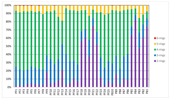 To infer information about the potential sources of PAHs, we consider the diagnostic ratios most commonly used in the literature, including Flu/(Flu + Py), Ant/(Ant + Phe), following Perra et al. (2009) [42] and Han et al. (2019) [21], the relative concentrations of PAHs by aromatic groups (2-ring, 3-ring, 4-ring, 5-ring, and 6-ring PAHs), and the ratio between low molecular weight (2–3 rings) and high molecular weight (4–6 rings) PAHs (LMW/HMW).