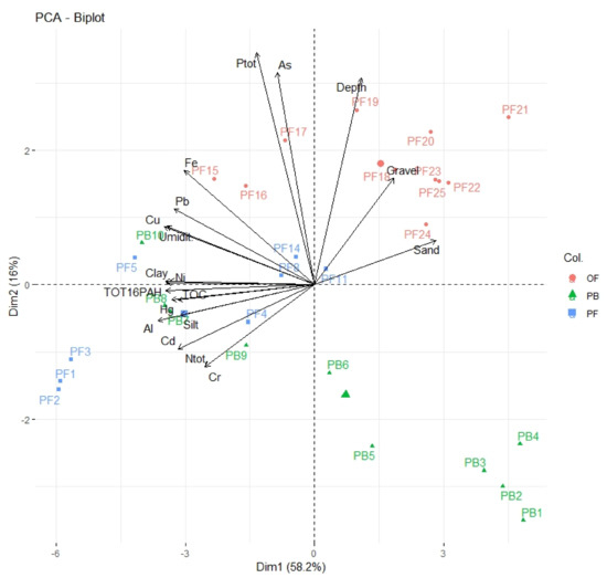 Principal Component Analysis (PCA) was finally performed with spectral decomposition function in order to examine the relations among pollutants and sediment parameters. Prior calculation data were log-transformed, centred, and scaled. High collinearity levels among sediment texture and pollutants were checked with Spearman rank correlation coefficient (rs, [40]). All calculations were performed with the R package [43]. The chosen significant threshold was p < 0.05.