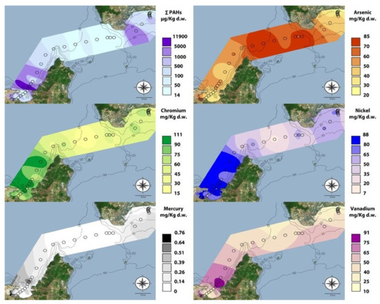 The spatial distribution of metals in sediments suggests their land-based sources. In general, the PF area was the most contaminated. The high levels of metals (in particular V, Pb, Ni, Cr) were likely related to anthropogenic pollution. Elba island has been one of the most important iron mining areas in Italy since Etruscan times [44]. Extraction activity ceased in 1981 and left many abandoned mines, and waste dumps, mineral deposits, and heavy metals and metalloids (As, Cr, Co, Cu, Pb, Ni, and Zn) related to iron extraction and processing, with consequent water and soil contamination [45]. Those metals likely accumulated in coastal sediments due to weathering processes [44,46,47]. In the same way, metals (Ni, Pb, Hg, Cu, and Zn) found in sediment in the PB area can be attributed to the steel industry and power plants located in the industrial area, as suggested by previous studies [46,48].