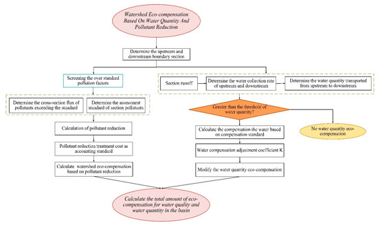 A new ecological compensation model is established in this study for watersheds with cross-administrative units: the impacts of upstream areas on downstream rivers in water resources and water environment are concentrated on the cross-section of rivers set up in the two administrative regions. The total amount of ecological compensation is calculated by considering the number of water resources and the quality of the water environment (Figure 2).