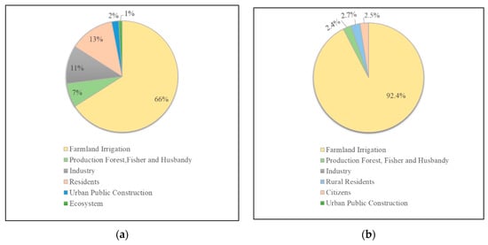 According to the diachronic curve analysis of the runoff of the Bahao Bridge in the Overall Plan, it can be seen that in a special dry year (guarantee rate of 95%), the outbound water volume of Q95 is 90 million m3, so it is set as the threshold for water volume compensation. The minimum limit for the amount of water left upstream must be reached at the threshold, only then can obtain the water quantity compensation fund. Analyzing the structure of agricultural, industrial, and domestic water consumption (Figure 4a) and the contribution rate of water-saving (Figure 4b) in the upper reaches of Zhangjiakou City, we can see that agricultural water accounts for the largest proportion and has the highest water-saving potential.