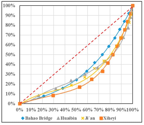 In this paper, the water quality–water quantity Gini coefficient of the Bahao Bridge section (115.4° E, 40.4° N) and Huaibin section (115.4° E, 32.4° N), Ji’an section (115.0° E, 27.0° N), Xiheyi section (115.4° E, 30.3° N) which are located in three different rivers from north to south are listed (Figure 5). The water quality–water quantity Gini coefficient in the southern regions with abundant water quantity is less than that in the northern regions with large seasonal variation of water quantity, indicating that compared with the southern region, the influence of water quantity on the pollutant concentration in the northern rivers is more severe.