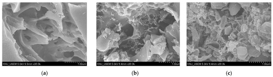 The SEM images of (a) M–biochar, (b) MN–biochar, and (c) MZ–biochar.