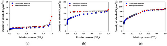 N2 adsorption-desorption isotherms of (a) M–biochar, (b) MN–biochar, and (c) MZ–biochar.