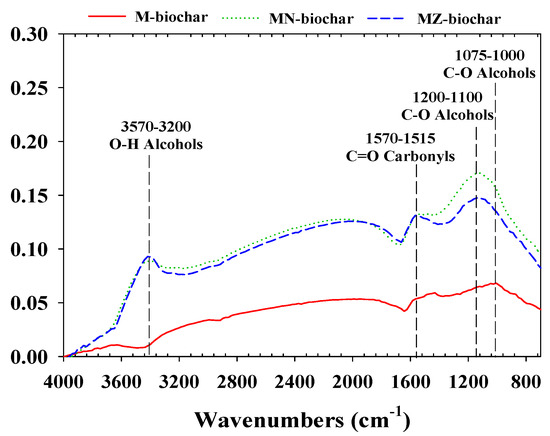 The ATR–FTIR spectra of M–biochar, MN–biochar, and MZ–biochar.