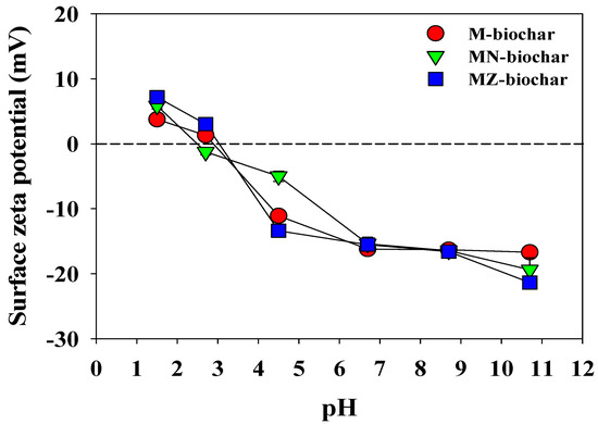 Surface zeta potential of the M–biochar, MN–biochar, and MZ–biochar (n = 3).