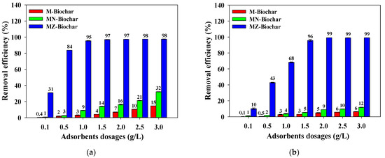 The influence of absorbent doses on the removal efficiency of the MO and FG using M–biochar, MN–biochar, and MZ–biochar: (a) MO and (b) FG (C0 = 10 mg/L; agitation speed = 160 rpm; contact time = 1 h; pH = 7.0; temperature = 25 °C, n = 3).