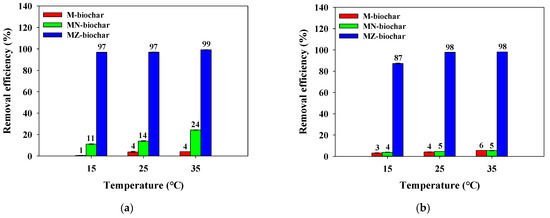 The influence of temperature on the removal efficiency of the MO and FG using M–biochar, MN–biochar, MZ–biochar: (a) MO and (b) FG (C0 = 10 mg/L; adsorbent dose for MO = 1.5 g/L, adsorbent dose for FG = 2.0 g/L; agitation speed = 160 rpm; contact time = 1 h; pH = 7.0, n = 3).