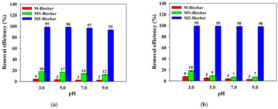 The influence of pH on the removal efficiency of the MO and FG using M–biochar, MN–biochar, MZ–biochar: (a) MO and (b) FG (C0 = 10 mg/L; adsorbent dose for MO = 1.5 g/L, adsorbent dose for FG = 2.0/g; agitation speed = 160 rpm; contact time = 1 h; temperature = 25 °C, n = 3).