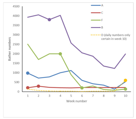 Daily bather numbers and Cryptosporidium detections (represented by circles) at five pools (A, B, C, D and F) provided the total bather number for the day of sampling. School holidays likely influenced bather numbers at most pools. Pool D was in Scotland where only sampling weeks 1 and 2 were in the summer holidays and week 10 was in the October holiday. For all other pools sampling weeks 1 to 5 were in the summer holidays.