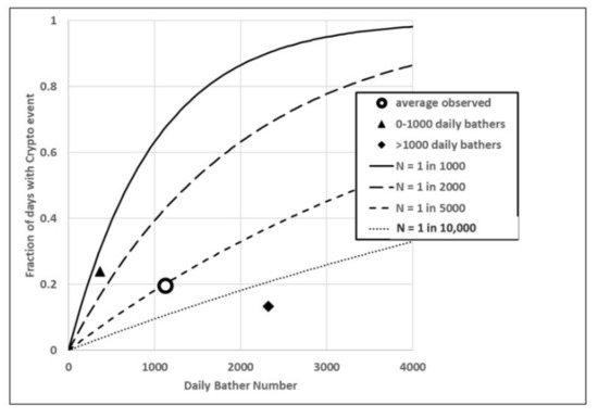 The impact of daily bather number (n) and the probability of a bather being an oocyst shedder (N = 1 in 1000, 1 in 2000, 1 in 5000 or 1 in 10,000) on the fraction of days with detectable Cryptosporidium contamination. Lines show predicted results using Equation (1) and symbols show the observed results.