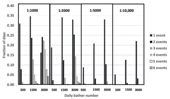 Monte Carlo analysis of the predicted impact of daily bather number (n = 500, 1500 or 3000) and the probability of a bather shedding a detectable number of oocysts (N = 1 in 1000, 1 in 2000, 1 in 5000 or 1 in 10,000) on the number of Cryptosporidium contamination events expected in a single day (expressed as the fraction of days predicted to have one to six events).