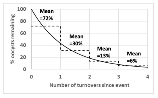 The decline in the concentration of oocysts for a pool where 57% of particles present at the start of each turnover are removed during the course of the turnover period. The histograms show the approximate average percentage of the initial concentration of oocysts expected to be present in the pool throughout each successive turnover period following the contamination event.