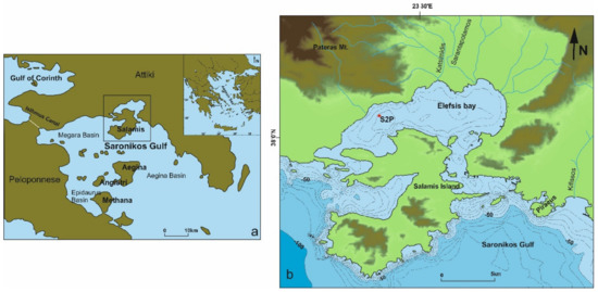 Location maps of the study area: (a) the Saronikos Gulf; and (b) the Elefsis Bay and the S2P coring location (source Hellenic Navy Hydrographic Service).