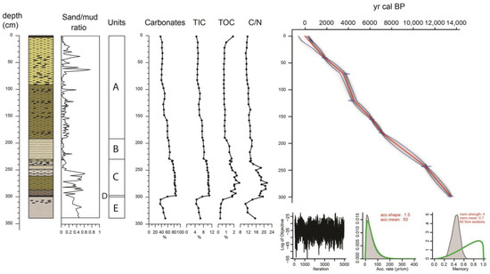 TOC/Ntotal ratios of pure marine organic matter are usually less than 8, while those between 8 and 12 indicate a mixed source of organic matter from land and sea [103]. Therefore, considering the relevant profile in Figure 2, Unit D and most of Unit C (248–297 cm) can be interpreted as terrestrial environments (C/N: 16–21.5), while the signal in Unit A reveals a marine environment, which, however, is affected by terrestrial processes (C/N: 10.8–13). Eventually, Unit B and the rest of Unit C display C/N values (13–14.6) that imply a transitional depositional system, e.g., estuarine or lagoon.