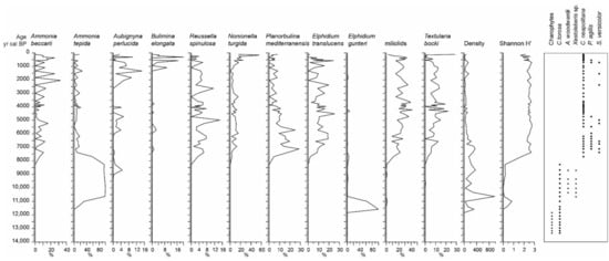 Only the scarce occurrence of the foraminifer Elphidium gunteri was recorded during most of this stratigraphic interval (Figure 3). However, after 11,580 cal BP an evident increase of the FD values is observed, characterized by the concomitant presence of E. gunteri and Ammonia tepida. Elphidium gunteri is a common and, sometimes, dominant species in marshes and brackish lagoons and waters [23,111,112,113], which is, however, capable not only surviving but even thriving in lacustrine environments of extremely low salinities (even <2) [114]. Also, it is generally recorded in intertidal environments along with A. tepida, which is an euryhaline opportunistic taxon exceptionally tolerant in salinity and temperature fluctuations [115,116]. Therefore, the simultaneous increased occurrence of the previous species in the current stratigraphic interval should be related to a high abundance of blue-green algae since the aforementioned species feed on these algae [117]. This actually reflects a very low salinity paleoenvironment [118].