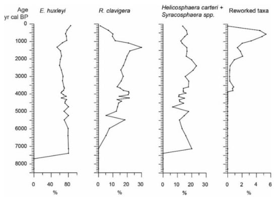 Seventy-five samples have been prepared for Calcareous Nannoplankton (CN), following the standard smear slide techniques. Out of them, only forty samples in the last 186 cm of the core, were bearing CN assemblages. Detailed descriptions of the quantitative counting methods and taxonomy of CN analysis are presented in the studies of Triantaphyllou et al. and Triantaphyllou [25,26,79]. The results of the analysis are expressed as percentages in order to avoid any dilution effects, e.g., lithogenic input [80]. The variation in the joint abundance of Helicosphaera carteri and Syracosphaera spp. is used as a paleotracer of fresher upper water layer (e.g., [80,81,82]). Helicospahera carteri has been reported exhibiting high frequencies in modern regions influenced by riverine discharge [83], as a coastal water taxon (e.g., [84]). Hints for an opportunistic behavior in estuarine environments, have been already given by Cachão et al. [10,85,86]. The abundances of reworked taxa from older sedimentary units are used as a lithogenic input proxy.