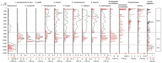 - PZ-I (297–248 cm; 13,500–11,350 cal BP): Botryoccocus coenobia are the dominant aquatic palynomorphs within this zone, displaying a mean concentration of 150,000 c/g (coenobia/g) and a distinct maximum concentration of 330,000 c/g. The mean concentration of aquatic vascular plants is 870 g/g, while dinoflagellate cysts are absent.