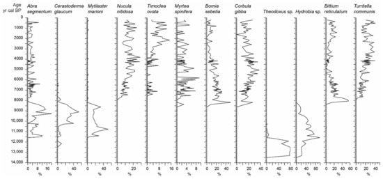 Finally, from 187 cm to the top (after 7500 cal BP), a rich variety of species is observed, including the dominant bivalves Bornia sebetia, Corbula gibba, Myrtea spinifera, Nucula nitidosa, and Timoclea ovata, and the gastropods Bittium reticulatum and Turritella communis. The previous species show abundances varying between 60% and 94% of the total assemblage.