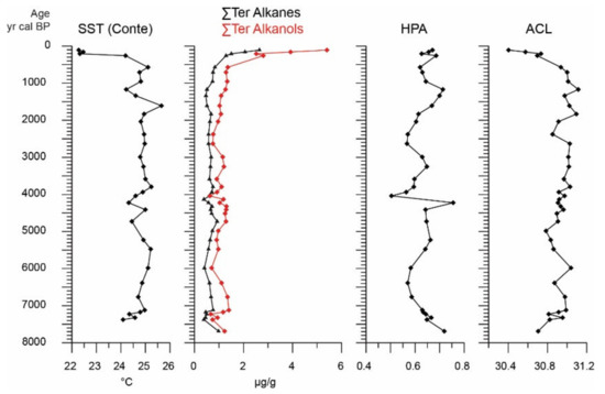 Selected lipid biomarkers, i.e., aliphatic hydrocarbons, long-chain alkenones and aliphatic alcohols, were determined in thirty-eight samples of the sedimentary Unit A as indices of paleoenvironmental conditions and land–sea interactions. Lipids were extracted from freeze-dried sediments by ultrasonication with a mixture of dichloromethane/methanol (4:1, v/v) and individual compounds were identified and quantified by means of gas chromatography, following Gogou et al. [96]. Estimates of past sea surface temperatures (SSTs) were made using the unsaturation ratios of alkenones (Uk’37) [97]. The Uk’37 index was converted into SST using the global calibration of Conte et al. [98]. High molecular weight odd-carbon number n-alkanes (n-C27, n-C29, n-C31 and n-C33) and even-carbon number n-alkanols (n-C24, n-C26, n-C28 and n-C30), major components of epicuticular higher plant waxes, are used as proxies of allochthonous natural (terrestrial) inputs [99,100]. The sums of their concentrations are defined as ΣTerNA and ΣTerN-OH, respectively. Variations of the average chain length of terrestrial n-alkanes, i.e., ACL index [101], are commonly related to changes in the temperature and humidity/aridity in the growing environment, since plants tend to synthesize longer chain length waxes in response to elevated temperatures. The proportion of ΣTerN-OH in the sum of ΣTerNA and ΣTerN-OH (HPA index [101]) can be used to evaluate the proportions of labile and refractory organic matter delivered in the marine environment as well as in situ preservation vs degradation.