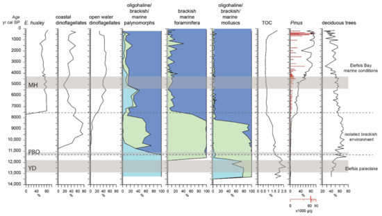 The establishment of marine conditions in the Elefsis Bay is marked by the development of diverse dinoflagellate, benthic foraminiferal, and mollusc assemblages at 7500 cal BP as well as the introduction of coccolithophores in the assemblages (Figure 3, Figure 4, Figure 5 and Figure 6). The dinoflagellate assemblage is characterized by a sharp decrease of the low salinity species and the development of a marine assemblage consisting mainly of L. machaerophorum, Sp. Bentorii, and P. zoharyi (see PZ-III in Figure 5). In particular, the high abundances of the long processes morphotype of L. machaerophorum and the co-occurrence of P. zoharyi, S. bertonii, and S. belerius at the bottom of this interval (see PZ-III Figure 5) are indicative of a coastal environment enriched in nutrients due to enhanced terrestrial discharges [88,136,166,167]. The dinocyst assemblage becomes gradually enriched with pelagic species, such as Sp. delicatus, S. membranaceus, S. mirabilis, and O. centrocarpum, evidencing the deepening of the marine environment (Figure 8). The contemporaneous occurrence of E. huxleyi in the sedimentary record (Figure 4) implies the establishment of full marine conditions in the Elefsis Bay, with a sufficient water column depth, i.e., at least 20 m, to sustain the pelagic coccolithophore community (e.g., [168]), conditions that coincide with the increase of pelagic environment dinoflagellate cysts (see Figure 8). Likewise, in benthic communities the marine transgression is featured by a sudden increase in diversity and the appearance of several marine species in the foraminiferal, ostracod, and molluscan assemblages; the latter comprising several typical marine gastropod and bivalve species, such as B. sebetia, N. nitidosa, T. ovata, B. reticulatum, and T. communis. The benthic foraminiferal composition until 4000 cal BP (Figure 3) mainly includes typical marine species of the infralittoral zone, such as A. beccarii, small epiphytic rotaliids, E. translucens, miliolids, and agglutinated taxa [72,111,169], similar to modern coastal environments of the Aegean Sea [23,73]. The abundance of the euryhaline A. tepida dramatically decreases, while A. beccarii appears together with shallow-water epiphytic foraminifera, such as P. mediterranensis, R. spinulosa, and T. bocki, common in the infralittoral and circalittoral zones of the Mediterranean Sea [72,170,171]. Similarly, the ostracod fauna comprises the typical marine species of C. neapolitana, P. agilis, S. versicolor, and L. multipunctata (e.g., [75,77,145,172]). In particular, C. neapolitana being the most abundant in the ostracod assemblages, indicates water depths higher than 20 m, tolerating organic matter enrichment and oxygen depletion [173,174].