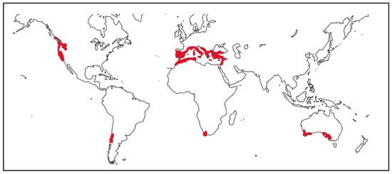 Biogeochemical processes in wetlands are highly dynamic [,] and involve complex interactions between hydrological processes, mineralogical transformations, and bacterial and vegetation communities [,]. The increasing worldwide affectation of wetlands by a shift in environmental conditions due to climate change, land use development, resource extraction, urbanization, and sea level rise [,], will lastly alter the hydrological regime, impacting the biogeochemical processes. Although some previous reviews have been conducted, both under a global perspective [,,] and under a regional context [], the present study is the first review focused on Mediterranean wetlands, which are among the most threatened ecosystems due to climate change and natural habitat loss []. Mediterranean wetlands are considered as unique ecosystems exposed to Mediterranean climate forcing, and thus they are located in a more extensive region beyond the Mediterranean basin, including other geographic areas such as parts of California, South Africa, Chile, and Southern Australia [] (Figure 1). As a result of this climate, they are subjected to a strong seasonality in water supply outside the hot season and they also experience a long vegetation period that makes them quite distinct from the standard limnological paradigm []. Apart from these external conditions, several internal features (i.e., shallowness and a typically high catchment area to lake area ratio) make Mediterranean wetlands especially sensitive to water level fluctuations induced by global change.