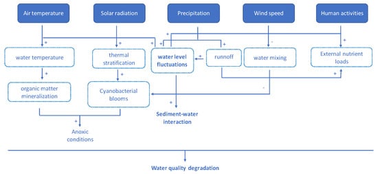 Lastly, Figure 2 summarizes the impacts of global change on Mediterranean wetlands. In brief, major drivers of global change are: (i) air temperature; (ii) solar radiation, (iii) precipitation, (iv) wind speed, and (v) human activities. As greenhouse gases increase in the atmosphere, the increase in radiative forcing results in higher surface temperatures, increased water-holding capacity of the atmosphere, increased evaporation, and larger water vapor amounts []. In fact, larger water vapor content (a greenhouse gas) will also result in a positive feedback [,]. On the other hand, it has also been reported that global warming and solar radiation have mutual connections [,]. In particular, Nazari-Sharabian et al. [] made a detailed explanation of the connection between both solar radiation and global change and the inherent implications. Climate change is also expected to increase the frequency and intensity of droughts and extreme flow events [,] which will reduce freshwater availability and quality. The wind will also be affected by climate change, causing both direct and indirect impacts on water resources []. Modeling results for predicting the wind speed in different regions in 2050 have shown that some areas (e.g., Northern Europe and Central and South America) will be affected by stronger surface wind speeds, while decreasing wind speeds have been predicted for Southern Europe and Eastern and Southern Asia []. Accordingly, Mediterranean wetlands are expected to present higher water column thermal stabilities, which, otherwise, will likely cause more frequent Cyanobacterial blooms [,,]. Additionally, and as Nazari-Sharabian et al. [] suggested, human activities linked to an increasing population, rapid urban development, and lack of land use planning, continually contribute to the degradation of the environment and water resources. More specifically, human activities cause an increase in external nutrient loads to Mediterranean wetlands, both directly (e.g., discharge of treated and untreated wastewaters) and indirectly (e.g., changes in catchment land uses) [,]. Furthermore, human activities also generate an over-exploitation of water resources that lastly leads to increased annual and interannual fluctuations of water levels, far beyond natural amplitudes []. As a result, the combination of all stressors driven by global change will dramatically impair the water quality of these threatened ecosystems by increasing both internal and external nutrient loads. Next, in this review, we will focus on the effect of changes in water level on phosphorus cycling and greenhouse gas emissions.