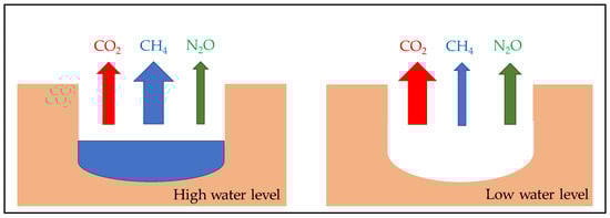 From this outline, it is clear that all processes involved in CO2, CH4 and N2O production are oxygen-dependent and, thus, the hydrology (shifts in the dry–wet cycle) may play a key role in their final function as a sink or as a source. In fact, oxygenation is assured in desiccated sediments, while anaerobiosis depends on a number of factors, such as the sediment structure, temperature and the presence of bioavailable carbon to support metabolic activity []. Furthermore, greenhouse gas production is directly connected to changes in organic matter concentration in sediments (discussed earlier in this review).