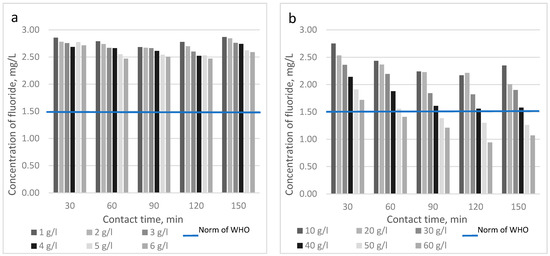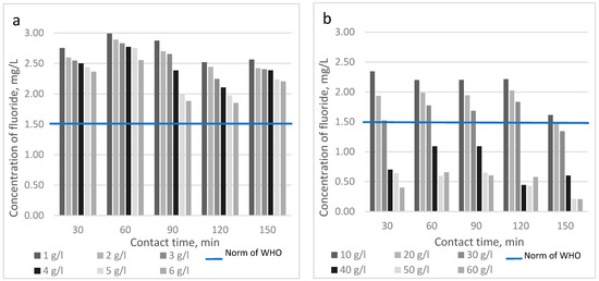 Figure 1 presents the results of the research when iron sludge is used. In all the samples, the fluoride concentration is 3 mg/L. How the fluoride concentration varies in samples when the sorbent dose and the contact time are changed was explored. Figure 1a shows how fluoride concentration varies depending on the contact time, when the iron sludge doses are 1, 2, 3, 4, 5 and 6 g/L and Figure 1b shows how the fluoride concentration varies depending on the contact time when the iron sludge doses are 10, 20, 30, 40, 50 and 60 g/L. In order for concentrations of fluoride in drinking water to correspond to the permissible norm of the World Health Organization, there are three main operating parameters of filtration: (1) nature of adsorbents, (2) extent of contaminants and (3) the hydraulics need to be investigated. In our research, we examine only one of the parameters—nature of sorbent. But in order to observe the changes in concentration of fluoride and compare whether it decreases enough as a reference point, we used the limit of permissible norm (1.5 mg/L) of the World Health Organization in Figure 1 and Figure 2.