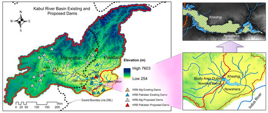 The elevation in the KRB Afghanistan ranges from 250 to 7600 m based on the 30 m DEM with steeper slopes and gorges in its headwater region and bare portions in the downstream River reaches. The annual average precipitation in the basin is about 459 mm [1,21]. The highest rainfall occurs during spring (March to May), with a highly variable precipitation pattern amongst nearby regions. Similarly, the annual average temperature of the KRB is about 8 °C. The array of existing and proposed dams in the KRB (Afghanistan and Pakistan) is listed in Table 1, with locations of each, as included in Figure 2.