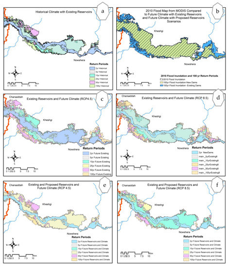 Figure 4. Flood inundation map for the Kabul River at Nowshera for various climate and dam scenarios for various return periods; (a) Flood inundation map under current climate and existing dams for various return periods, (b) 2010 MODIS flood inundation imagery compared to the simulated 100 year flood inundation map for the existing and proposed dams, (c) flood inundation under existing dams and future climate RCP 4.5 scenario, (d) existing dams and future climate under RCP 8.5 scenario, (e) flood inundation under existing dams and future climate under RCP 4.5 scenario, and (f) flood inundation under proposed dams and future climate conditions RCP 8.5 scenario.