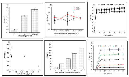 Results on the fluoride quantity adsorbed against initial Fˉ concentration (1, 5, 10, 15, 20 mg L−1) at neutral pH using 0.5 wt% Fe3O4-SiO2 nanocomposites calcined at 500 °C are shown in Figure 1e,f (concentration vs. time). The impact of the Fˉ concentration on Fˉ adsorption using 0.5 wt% of Fe3O4-SiO2 nanocomposites was investigated, and it was found that adsorption ability increased linearly with increasing initial fluoride concentrations from 1 to 20 mg L−1. It was noted that increasing F concentrations increased the driving force at the solid–liquid interface by increasing the adsorption power. The results revealed that the efficiency of adsorption was proportional to the initial concentration of fluoride ions. The adsorption capacity (instead of the adsorption rate) increased with increasing initial concentrations. This demonstrates that the adsorption mechanism is physi-sorption [50,51]. Previous studies using MOF-801 support the present findings that an increase in initial F− concentration (5.0–25 mg L−1) results in an increased adsorption due to an increase in the driving force at the solid–liquid interface [24,47]. Another study conducted on the defluoridation of drinking water also supports the findings of the present study that with an increase in the initial Fˉ concentration an increase in adsorption capacity can be observed [52]. The increase in adsorption potential is mainly because of the variations in surface charges with increasing initial concentrations (positive for modified nano alumina and negative for F−).