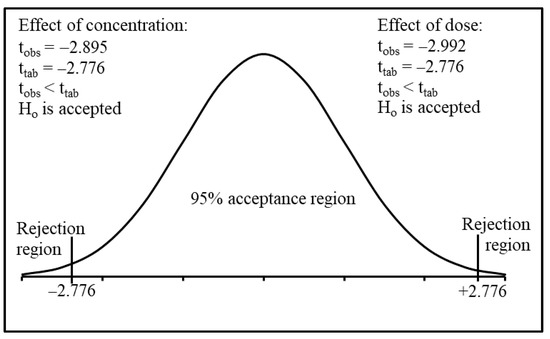 The σs value is ±3.07, while the tcal value is −2.992. However, the t value obtained from the Student’s t-test table (ttab) was −2.776 at a 5% level of significance for 4 df and a 2-tailed t-distribution (also known as Student’s T Distribution) [48,49]. As can be seen in Figure 2 the tcal value was less than ttab value, so the Ho (that the optimum dose was 0.03 g L−1) was accepted.