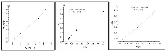 where Qe = amount of dye adsorbed (mg g−1), Ce = equilibrium concentration (mg L−1), Kads = equilibrium adsorption constant (mg L−1), and Qm = Qe for complete monolayer adsorption capacity (mg g−1). The Freundlich isotherm was used for non-ideal adsorption on heterogeneous surfaces. The heterogeneity arises from the presence of different functional groups on the surface, and the various adsorbent–adsorbate interactions. The Freundlich isotherm was expressed by the following empirical equation [41]: