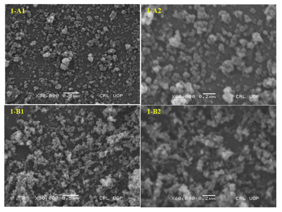 Scanning electron microscopy (SEM) and the FTIR spectrum were employed to observe the surface morphology and chemistry of the NMs and related NCs, as shown in Figure 4 (1-A represents NPs whereas 1-B represents NCs) and Figure 5, respectively. The SEM micrographs (Figure 4) of Fe3O4 nanoparticles and related nanocomposites after calcination at optimum operating conditions with 30,000–60,000 KX magnification are also shown. Based on the observation from SEM micrographs, NCs were seen as homogeneously distributed but noticeably agglomerated particles [59].