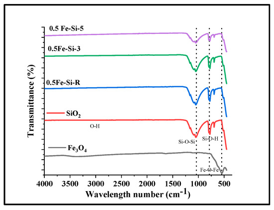 FTIR spectra of Fe3O4 nanoparticles and related SiO2 nanocomposites (raw and calcined at 300 °C and 500 °C).