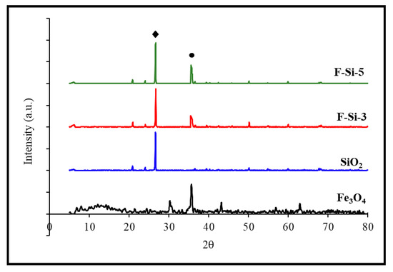 Phase identification and crystallite size estimation were carried out using XRD analysis. The typical XRD diffraction peaks related to the nanoparticles (Fe3O4 and SiO2) and related SiO2 nanocomposites are shown in Figure 6. Diffraction peaks were observed at 30.2°, 35.6°, 43.15°, 53.8°, 57.0°, and 63.0°, respectively, corresponding to the planes of cubic inverse spinel Fe3O4 (represented by a ball symbol) of 220, 311, 400, 422, 511, and 440 [59]. The incremental peak was at 26.6° for SiO2 (shown by a square), and the majority of the peaks were comparable to those reported in Fe3O4 XRD patterns. As calculated using Scherer’s formula [63] the crystallite sizes of the nanoparticles (Fe3O4 and SiO2) and related SiO2 NCs were around 22.55 and 56.01 nm for Fe3O4 and SiO2 NPs, respectively, and 24.88 and 23.79 nm for Fe-Si-3 and Fe-Si-5 NCs [58,59,61]. When the temperature increased, the crystallite size increased marginally, with irregular dispersion of the particle size. The increased frequency of a collision between such nanoparticle leads to an increase in the kinetic energy of the collision, giving the nanoparticles a strong tendency to overcome the potential barrier between them and clump into big particles.