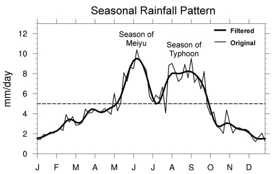 This method evaluates the rainfall performance of GCMs in the baseline period. The observation data are selected grid data with similar time and space resolutions; the area is shown in Figure 1a. After the model is processed into the same format as the observation data, Fourier analysis is performed to filter out high-frequency signals (especially during the Meiyu and typhoon seasons) (Wang and Lin, 2002) [] (Figure 2).