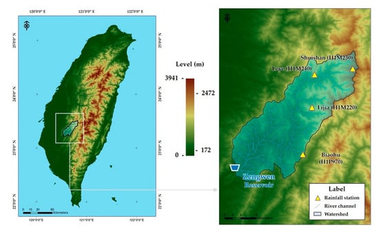 Four rainfall stations in the watershed, namely, Lijia (H1M220), Shuishan (H1M230), Leye (H1M240), and Biaohu (H1P970), were selected. All had valid records for 30 years (1976–2005). Figure 3 shows the geographical location of the watershed and rainfall stations of the Zengwen Reservoir.